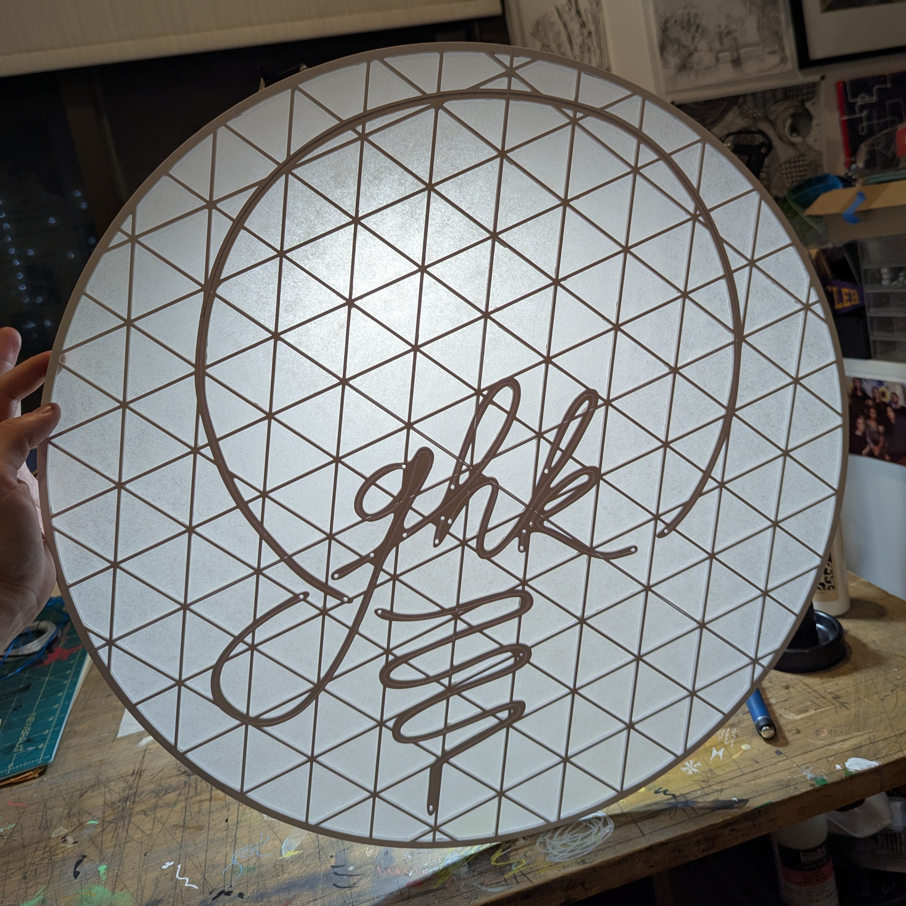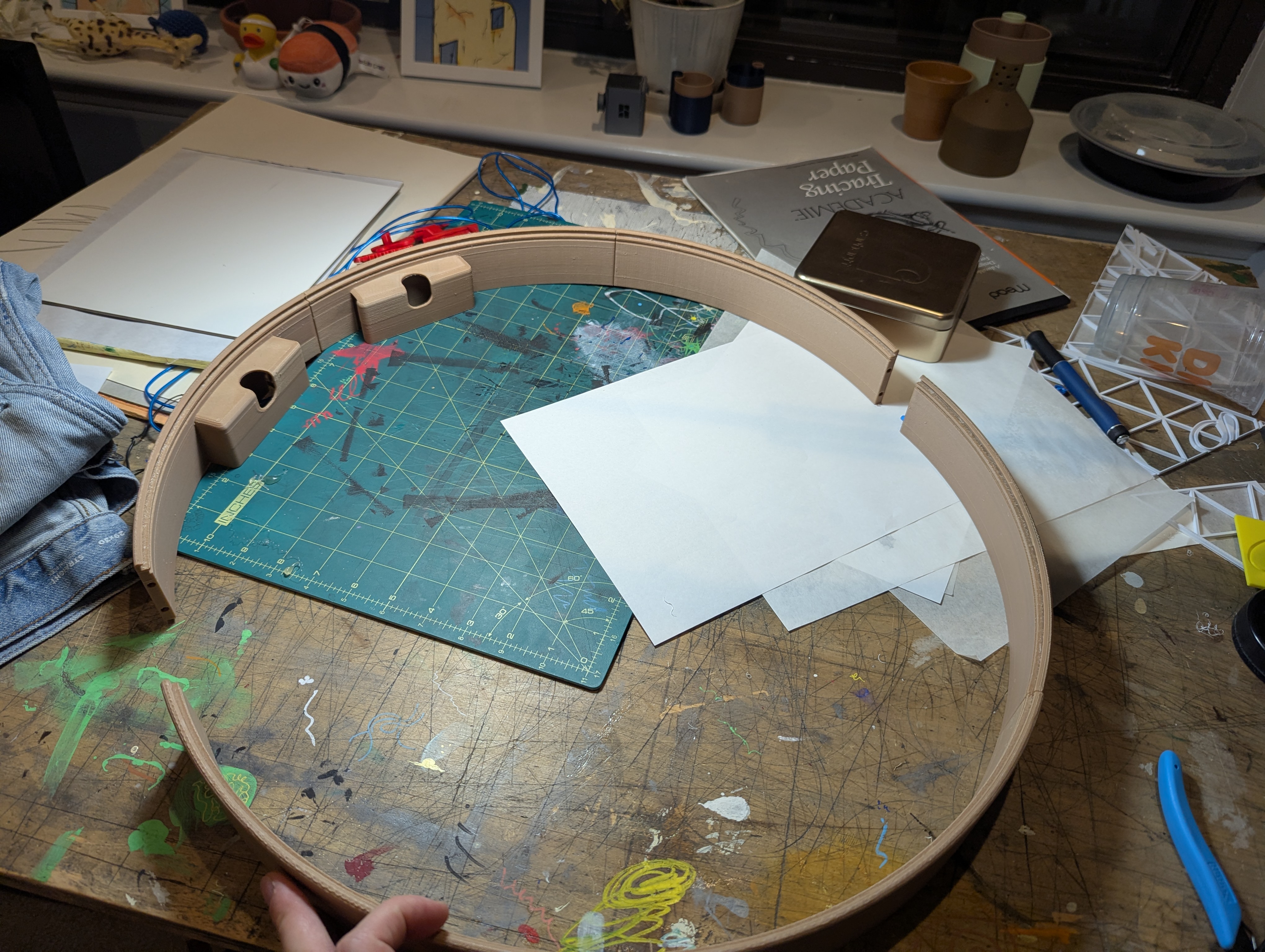 I went with a thinner size than him and split the model into 6 pie slices, so it was challenging to bond the pieces together. By heat-setting small washers into slots I printed into the back of the frame,