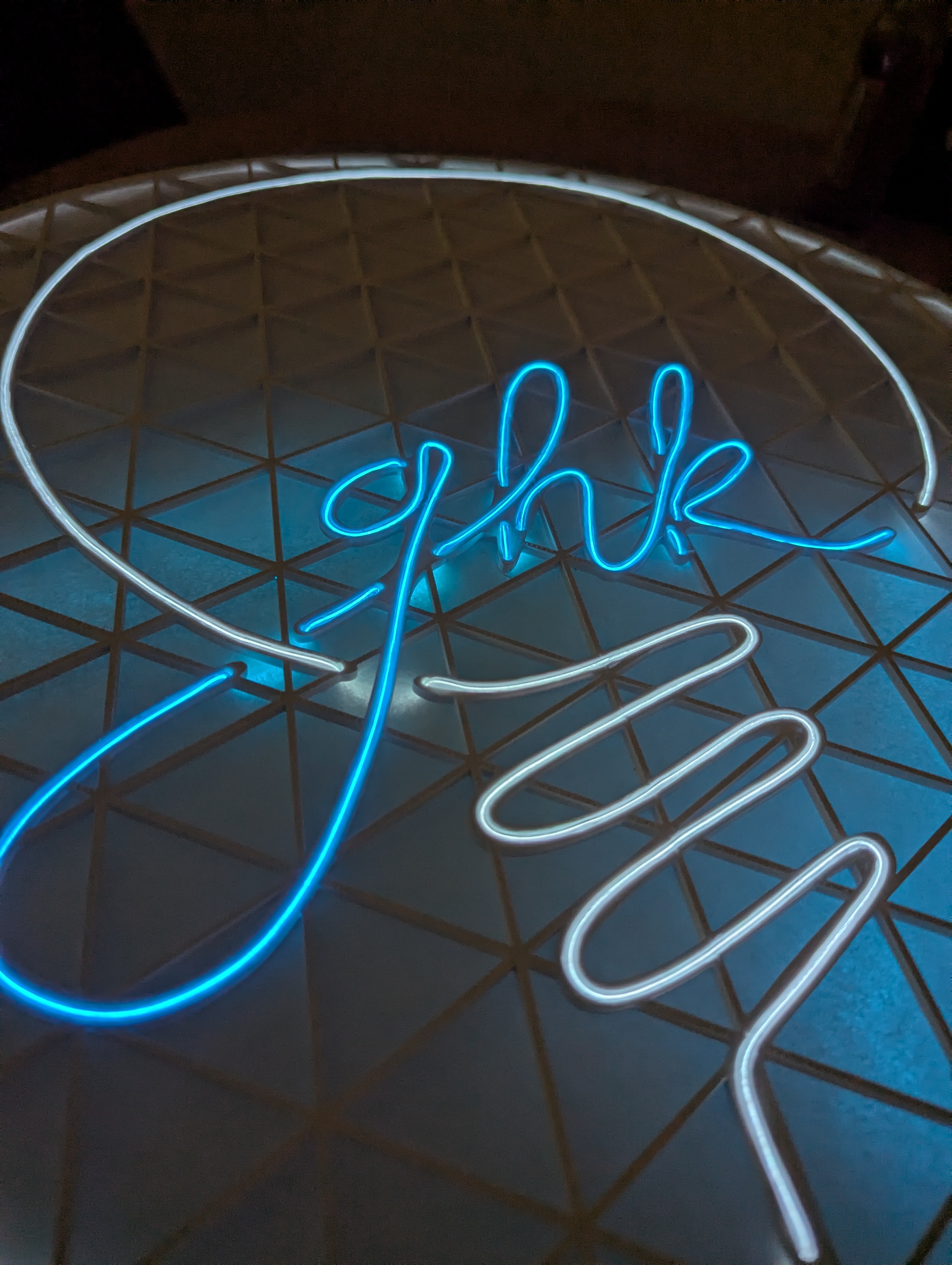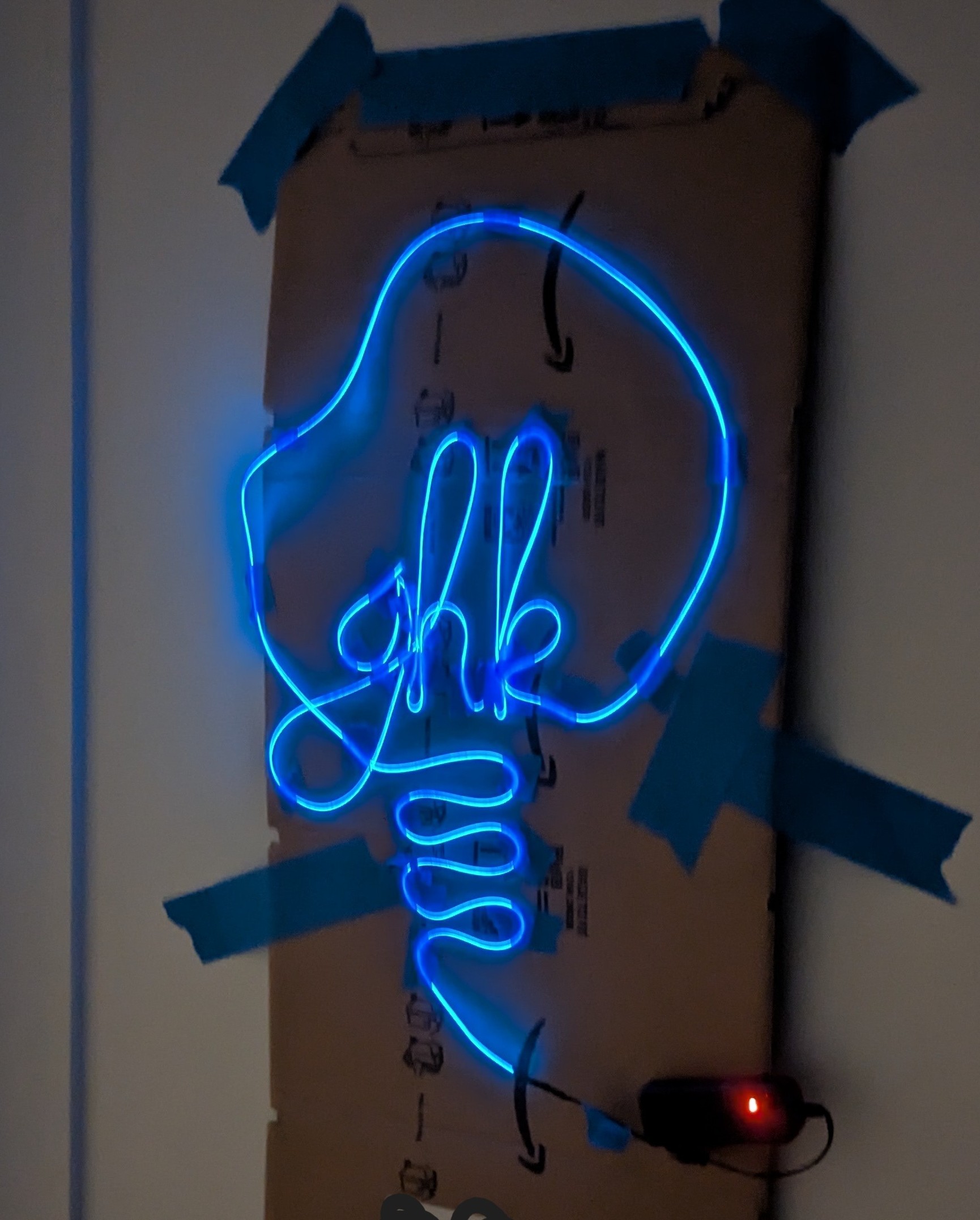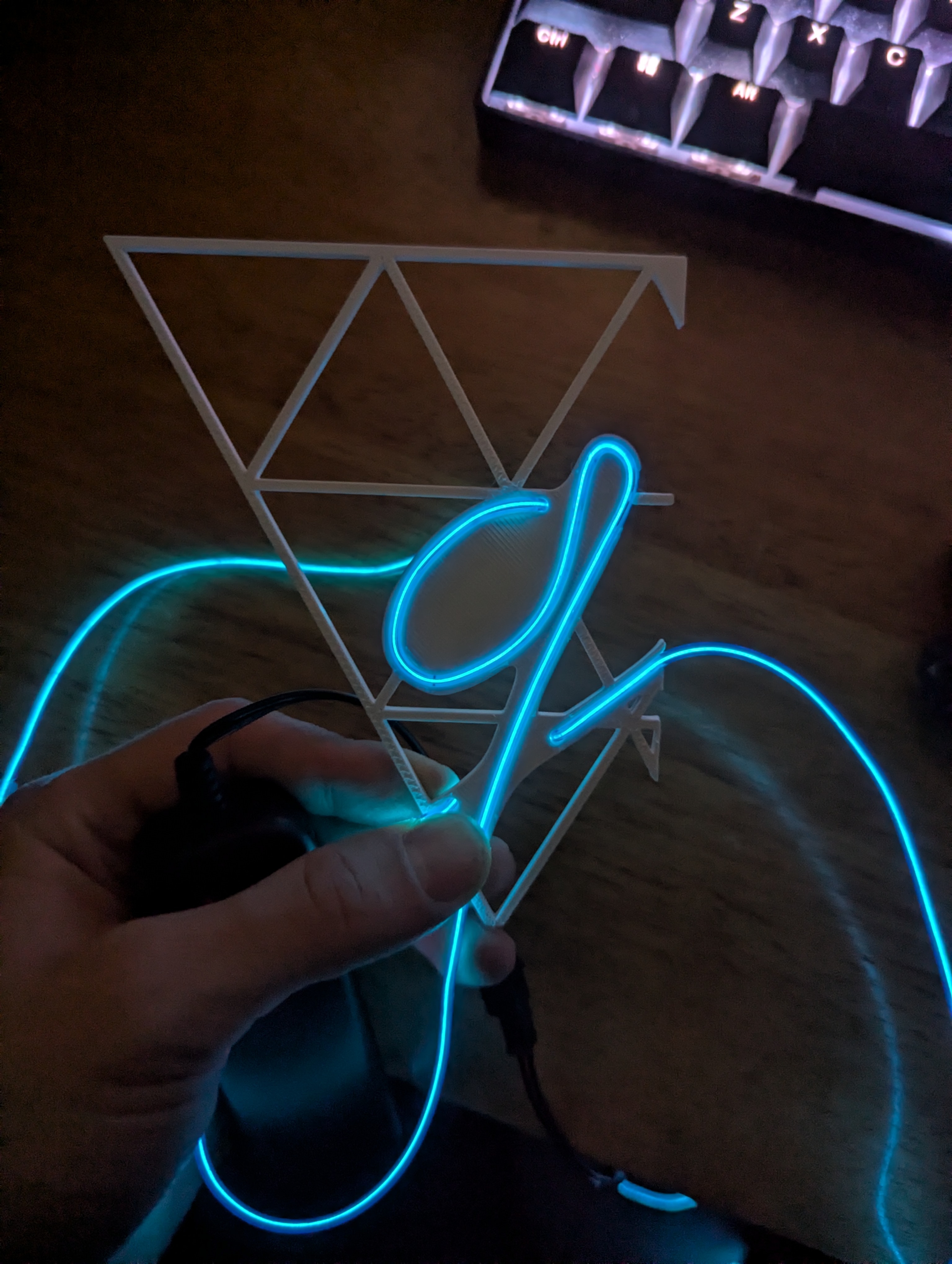 Someone a long time ago mentioned EL Wire to me as something I might enjoy playing with. I ended up buying a few samples on Amazon and got excited about the idea of putting the wire in the shape of my logo. I whipped up a prototype on a piece of cardboard with some tape and that was when I got super excited about the idea. It looked great even with such a sub-bar tape job!